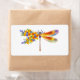 Artistically painted, floral dragonfly in contrasting orange and purple with yellow, bright, blooming California poppy and blue wildflowers on white background.