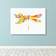 Artistically painted, floral dragonfly in contrasting orange and purple with yellow, bright, blooming California poppy and blue wildflowers on white background.