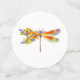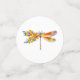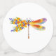 Artistically painted, floral dragonfly in contrasting orange and purple with yellow, bright, blooming California poppy and blue wildflowers on white background.