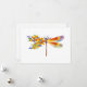 Artistically painted, floral dragonfly in contrasting orange and purple with yellow, bright, blooming California poppy and blue wildflowers on white background.