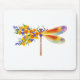 Artistically painted, floral dragonfly in contrasting orange and purple with yellow, bright, blooming California poppy and blue wildflowers on white background.