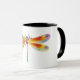 Artistically painted, floral dragonfly in contrasting orange and purple with yellow, bright, blooming California poppy and blue wildflowers on white background.