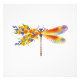 Artistically painted, floral dragonfly in contrasting orange and purple with yellow, bright, blooming California poppy and blue wildflowers on white background.