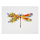 Artistically painted, floral dragonfly in contrasting orange and purple with yellow, bright, blooming California poppy and blue wildflowers on white background.