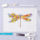 Artistically painted, floral dragonfly in contrasting orange and purple with yellow, bright, blooming California poppy and blue wildflowers on white background.