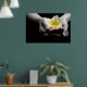 A floral photograph of a delicate yellow flower held in a pair of hands against a black background. The flower is a Hotei rhododendron.