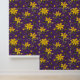 Big flowers pattern wallpaper with yellow flowers. Blooming St. John's Wort, with stems, buds, and leaves, is the seamless pattern printed over dark purple.