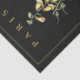 Decoupage tissue paper that looks like a vintage French title page with a yellow foxglove flower illustration in the centre and the word "Paris" at the top. Gold text and border on black background.