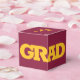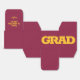 GRAD in bold yellow gold lettering wraps around the front of these maroon 2" square graduation party favour boxes with your name and thank you message on the top.