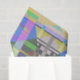 Colourful geometric shapes pattern, custom made artwork in prominent shades of yellow, green, blue, purple and with additional shades of burgundy, silver, grey, pink, gold. Elegant trendy digital art design.