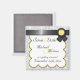 Beautiful wedding save the dates with a heather grey & white damask pattern and a black ribbon design with yellow at the top.