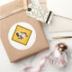 Round sticker of a yellow traffic warning sign with an icon vomiting over a toilet showing a hangover or pregnancy.