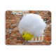 Photograph of a happy face antenna topper that has collected a fluffy hat of snow. Background of old much-patched red brick wall.
