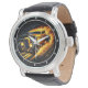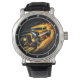 This bold watch face prominently features a yellow hot rod car with custom red and black flames painted on its side. The car is depicted on a dark road, with vibrant orange and yellow flames erupting from the ground beside it, resembling fire in grass. Dark, stylised clouds are visible in the background, creating a powerful, intense automotive scene.