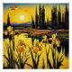 The A.I. created interpretation of vibrant yellow and gold colours dominate the landscape, where tall cypress trees line the riverbank under a sunset sky. In the foreground, a group of iris flowers is prominently displayed, their reflection visible in the calm waters below.