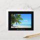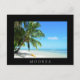 Postcard of a yellow kayak under a hanging palm tree on a white sand beach on the tropical island of Moorea, near Tahiti, in the Pacific archipelago French Polynesia with a black border and the text: 'Moorea'.