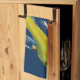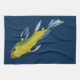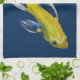 Japanese koi kitchen towel - From an original artwork painting in watercolour by Sacha Grossel of a yellow Japanese koi painted in free form Asian style brushwork. This decorative and ornamental fish pillow can be set against a customised background - it is shown here in traditional Japanese navy blue colour. Good Feng Shui - This painting is for koi and fish and Japanese art lovers everywhere
