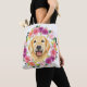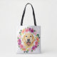 This pretty tote bag has a watercolor yellow Labrador Retriever Dog inside a floral wreath of purple, pink, peach, yellow, blue, and green watercolor flowers and leaves.