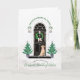Featuring a sweet Yellow Lab (Labrador Retriever) wearing a pink polka dot bow tie! A classic front porch decorated for the holidays, featuring Christmas trees with stars flanking the elegant black door, a pine wreath with pink gingham bow, and lanterns topped with roses and holly. In the style of Magnolia | modern farmhouse | classic elegant. 3 COLORS OF PLAID FOR THE INSIDE ARE IN THE DESIGN (black as shown, dark green, or pink - just edit and hide the plaid images you don't want).