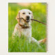 Horizontal image of a yellow labrador retriever dog sitting in grass with a stick in her mouth