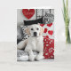 Yellow Labrador Valentine's card. Cuddly canine set against a contemporary background in red, black and white. No flowers, just hearts and bags of cuteness.