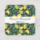 Business cards with a cute pattern featuring yellow lemons and green lime fruit with stalks of leaves set on a dark green background.