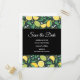 Save the date postcard with a pretty pattern featuring lemons and lime fruit with stalks of leaves set on a dark green background.