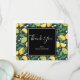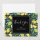Thank you card with a pretty pattern featuring lemons and lime fruit with stalks of leaves set on a dark green background.