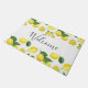 A welcome doormat with a cute pattern of yellow lemons with green leaves and fresh cut lemon slices. A white circle layered over top with your text inside.