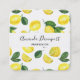 Square business cards with a cute pattern of yellow lemons with green leaves and fresh cut lemon slices.