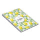 A spiral notebook personalised with a monogram initial and name inside a white circle with a black rope border. Designed with yellow lemons and green leaves, in a repeating pattern.