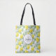 A tote bag personalised with a monogram initial and name inside a white circle with a black border. Designed with yellow lemons and green leaves, in a repeating pattern.
