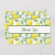 A thank you card with a message on the back. Designed with yellow lemons and green leaves, in a repeating pattern.