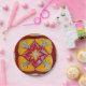 paper plates with hand painted mandala design- peace and unity - flower pattern in the middle - 4 people around - abstract art - red, yellow,pink,silver.For all yoga lovers, meditation, and free spirits.
