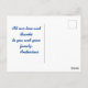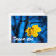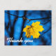 Image of a single yellow maple leaf on a twig against the dark blue background. White text Thank you in the lower left area. One-of-a-kind customisable postcard. The template text All our love and thanks to you and your family. Andersons on the back of the card. You can change or delete the template text on the front and on the back.