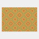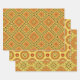 Set of three wrapping paper sheets with different decorative patterns. Each pattern features geometric shapes in yellow and orange shades.