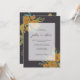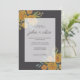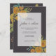Classic and elegant wedding invitation designed with yellow roses and peonies, botanical and eucalyptus leaves in a dark brown background. Write your wedding details in clean serif fonts.