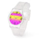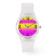 I only have one complaint. I ordered the watch with clear case and strap, and what was sent was white case and strap. I'm going to keep it because 1) it looks very nice in white, and 2) it would take too long to get a replacement made and sent in time for my occasion. Aside from the mix up with the color, the watch does look very good in white. The purple dial is actually sparkly which did not show in the online images. That was a nice surprise. If you like Swatch watches this is very similar to those. It's 33.6mm in diameter, 10.5mm thick, and 40.6mm lug to lug. Stainless steel case back says 3ATM/30m WR, so no swimming or showering or submerging this one. If you like Woodstock, this is a great choice.
