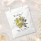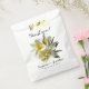 Floral wedding favour bags to say “thank you” to guests. Yellow and white plumeria flowers design with text above and below the realistic bunch of flowers. Include names of the bride and groom with wedding date. White bags come in sets of 50 in two paper types.