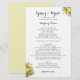 Floral wedding menu template with plumeria flowers. White and yellow flowers decorate the corners of white paper with black text templates. Include names of the bride and groom, location of event, menu title, and date. All food and menu items are added in a paragraph. Use spaces as needed to fill in the area. The paper is affordable for a casual wedding, or transfer the design to better paper as you wish.