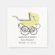 Lovely baby shower paper napkins, with graphics of a vintage looking yellow baby buggy, on a white background. Personalise the grey text for your baby shower event. Coordinating paper plates and invitations are available.