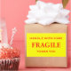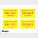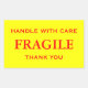 Stickers with: Fragile. Handle with Care. Thank you. Red text on a yellow background. Personalise with your information using the easy templates. Font colour, font style, font size, and yellow background colour are customisable.