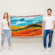 Colourful abstract landscape of hills and sky in colours of yellow, red, green, and blue.
