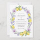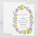 A vibrant watercolor design featuring bright yellow lemons nestled among lush green foliage and delicate purple orchids. The Mediterranean-inspired palette combines zesty citrus tones with soft lavender and periwinkle accents. This fresh botanical aesthetic evokes a sunny summer afternoon atmosphere, perfect for an outdoor Mediterranean or Italian-themed event.