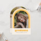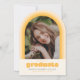 This fun retro inspired graduation announcement features space for a single photo on the front framed by an arch in shades of yellow. It also has space for the graduate's name, school, and class year. The back of the announcement has space for a second photo and more text.