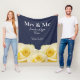 Yellow Rose Mrs. & Mr. Bridal Couple Wedding Gift Fleece Blanket. Floral personalised wedding blanket with a white trendy script on a navy blue background with lovely yellow roses. Customise the text and create a unique cuddly wedding gift with the bride and groom's names, wedding date and wedding location.