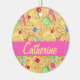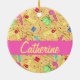 This ornament makes a great gift, or use it to say thanks, for someone who loves sewing or quilting. The ornament is easy to personalise with a name or words with the design on both sides. This colourful, whimsy art of sewing notions - sewing machines, pin cushions, rotary cutters, spools of thread, pins and needles tape measures and more on a creamy yellow background has a fuchsia hot pink bar for the personalisation and easy to customise with your own words. This sewing art is available in other colours and on coordinating products. Accent colours include red, blue, orange, pink and green. Fully customisable.
