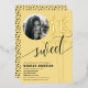 Brighten up a Sweet 16 celebration with this cheerful yellow invitation, featuring sparkling accents and a customisable photo option. Designed to make a milestone birthday even more special, this invitation includes foil details that add a touch of elegance. Personalise it with the birthday girl's name, event details, and a favourite photo for a unique and unforgettable invitation.