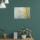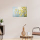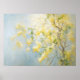 This pretty abstract impressionist artwork features yellow forsythia branches on a soft blue background.