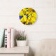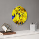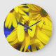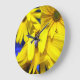yellow sunflower petals caress this blue tinted bee on this unique wall clock of blue and yellow